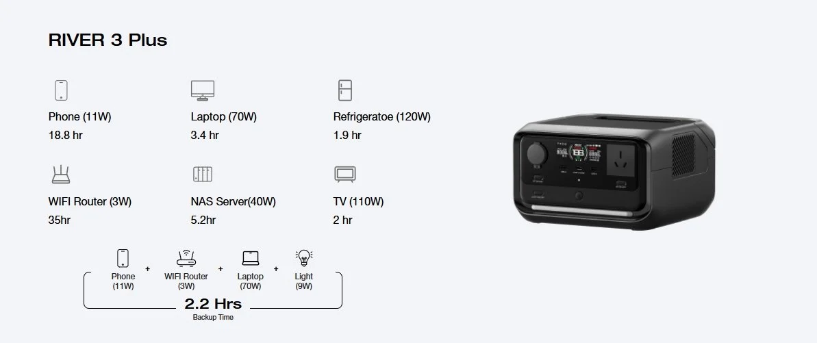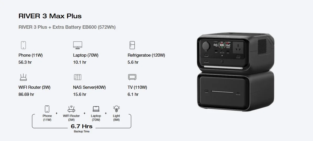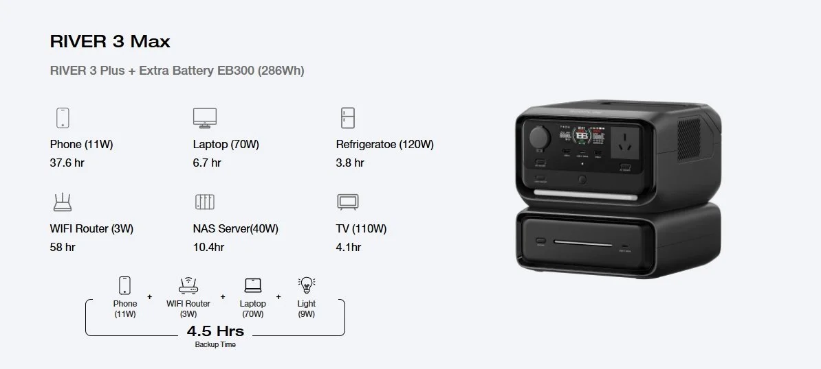 Level up your power with the RIVER 3 Plus and an Extra Battery. Handling either the EB300 (286Wh) or the EB600 (572Wh), just stack them up to get 858Wh of pure energy.