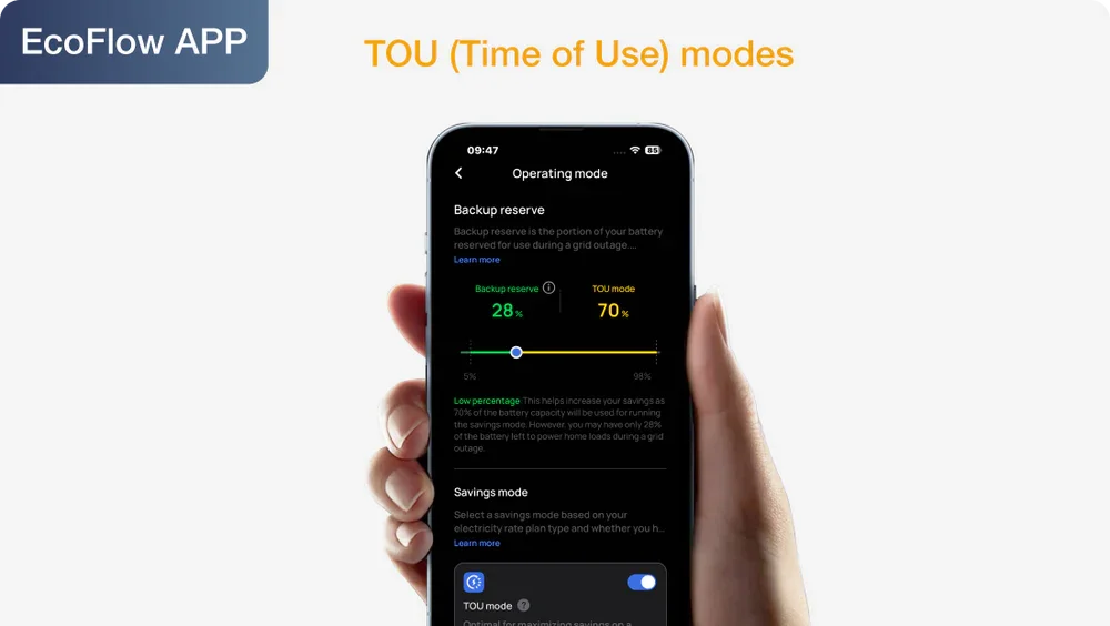 Storm warning mode and UPS power outage reminders swiftly activate backup power for essential appliances during emergencies. TOU (Time of Use) modes optimize electricity usage for daily bill savings.