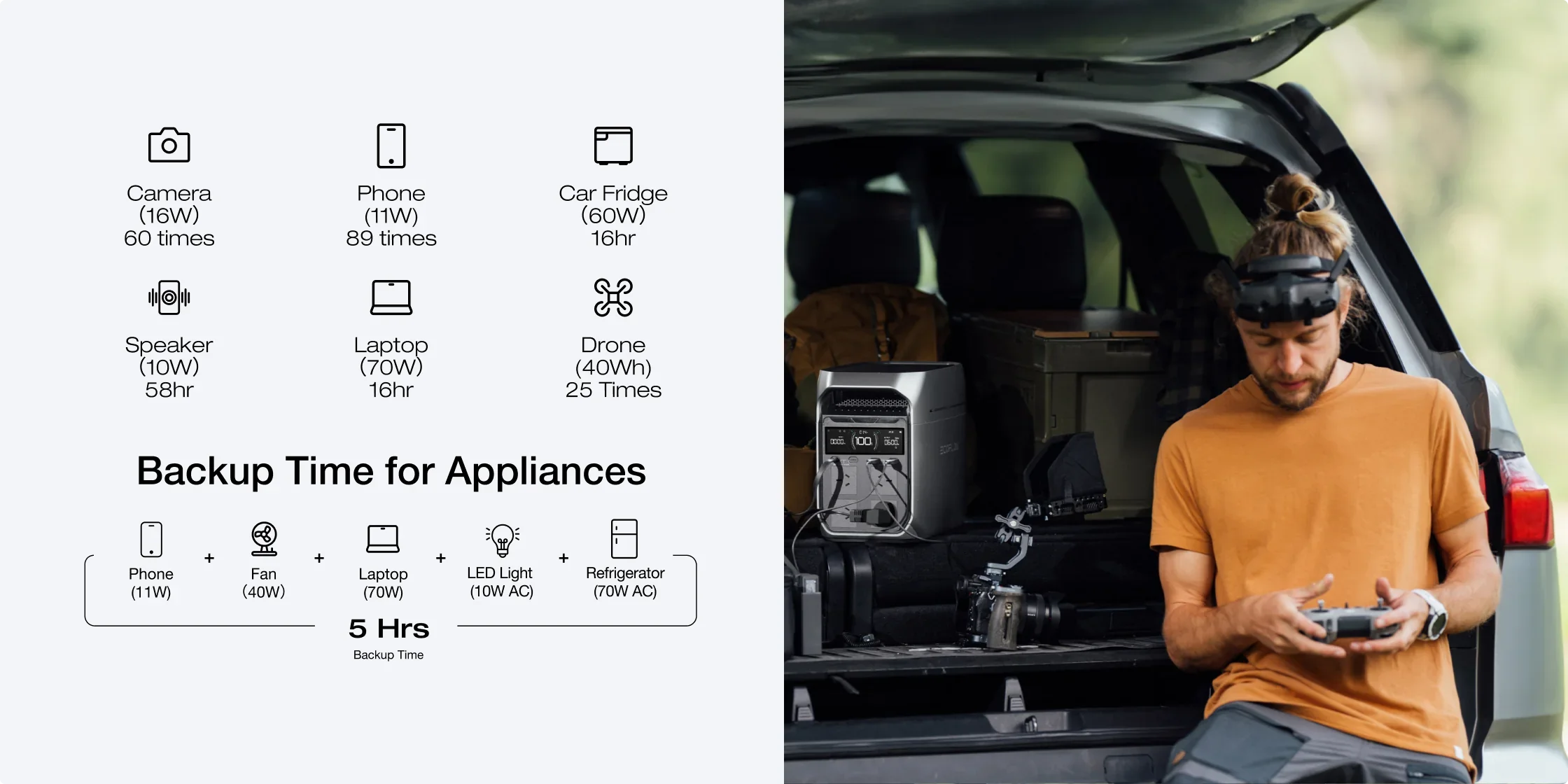 EcoFlow DELTA 3 Plus powers 99% of household devices, including reefrigerators, TVs, and computers. With X-Boost, it handles appliances over 2400W, like ovens (2150W), hair dryers (1800W), and kettles (1200W). Ideal for home backup, RVs, and outdoor adventures, it ensures you'renever left in the dark.