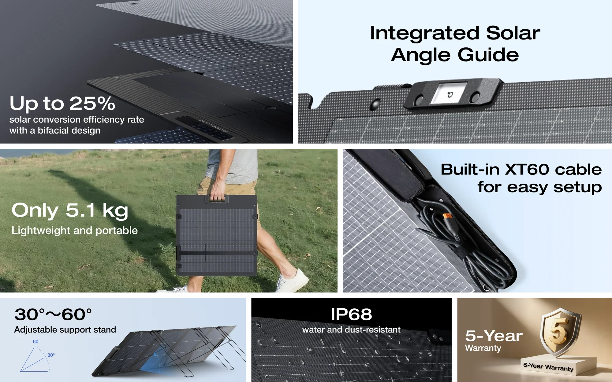 Engineered with advanced lightweight materials, this next-gen solar panel weighs 5.1 kg, 46% lighter than the 220W Bifacial Portable Solar Panel, enabling effortless transport and compact storage.