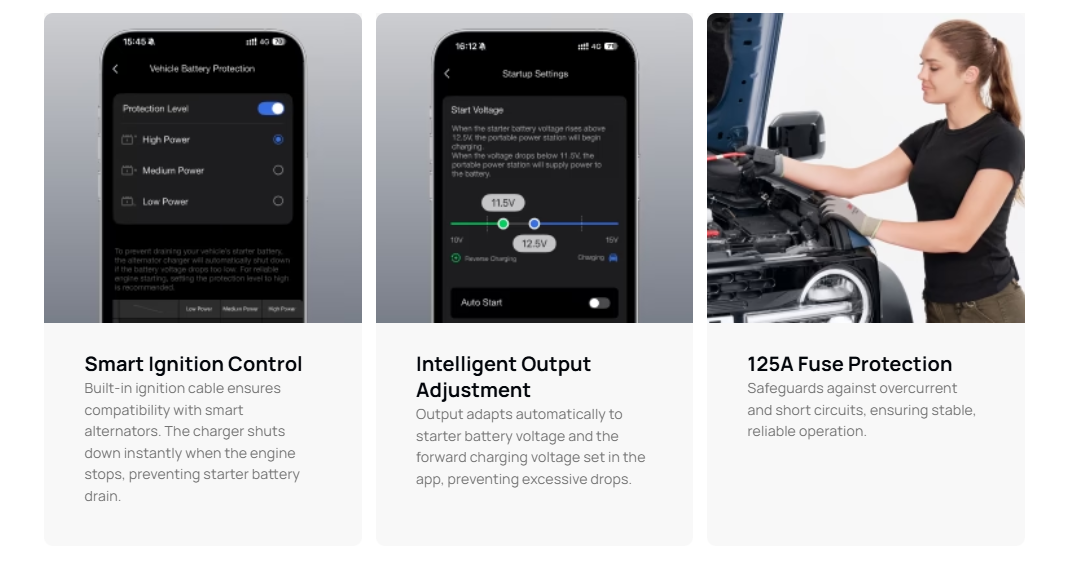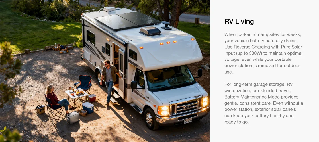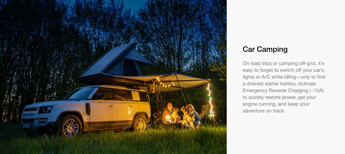 Supports reverse charging* to the starter battery via the power station or solar panels. This helps maintain vehicle battery health and prevents draining.