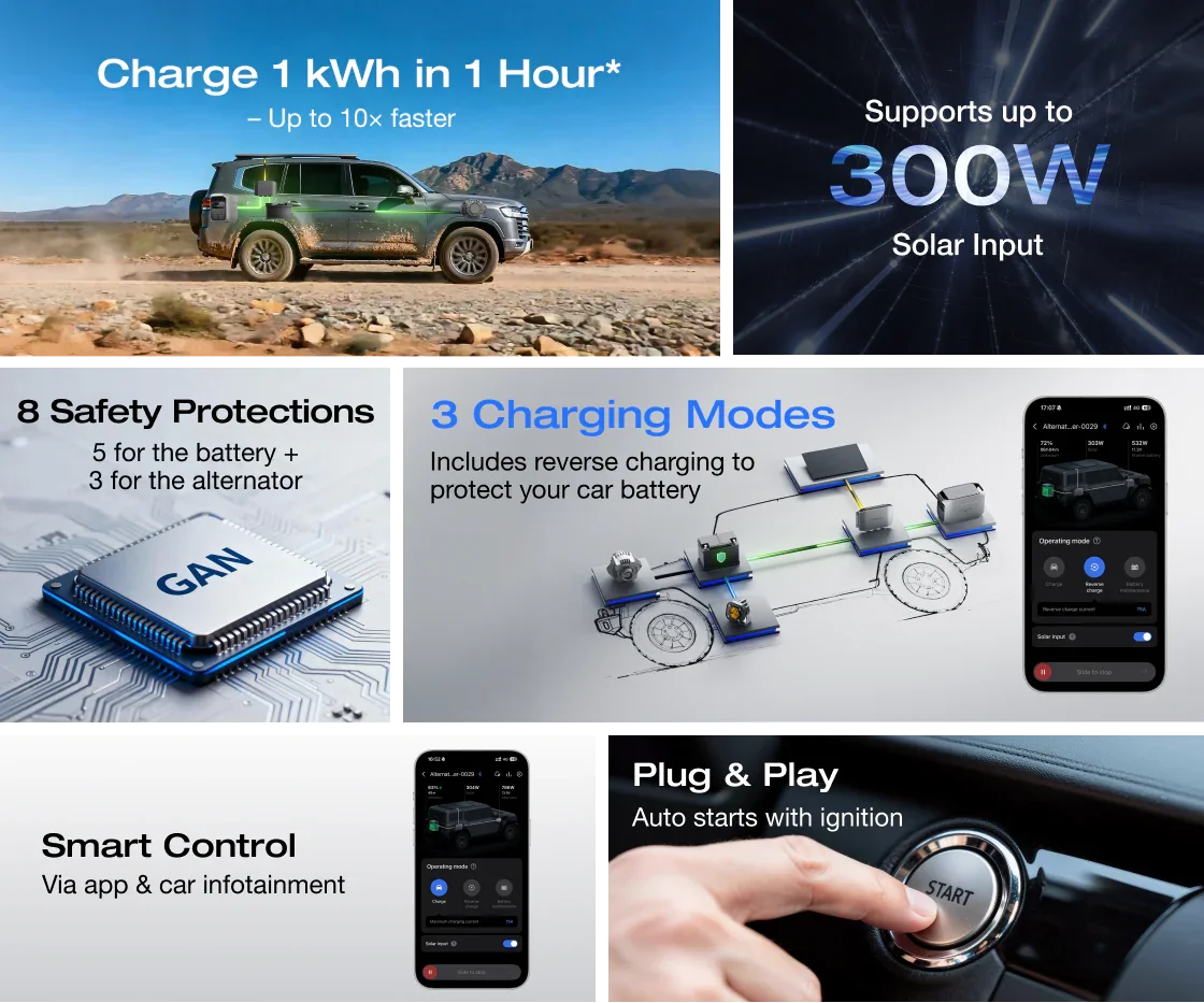 - Pure Solar Charging Mode – up to 300W: Use without a power station connected. Supplies power directly from solar panels to the starter battery.