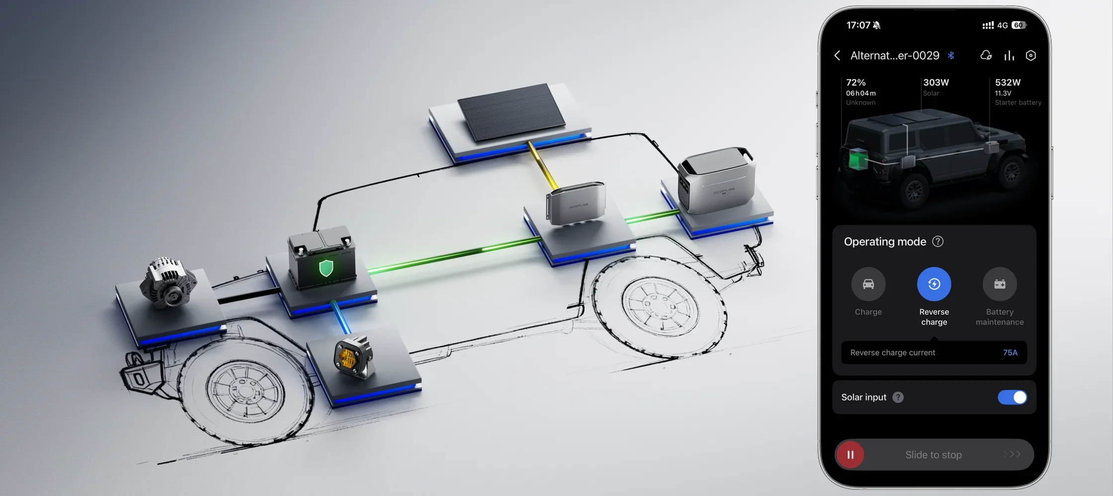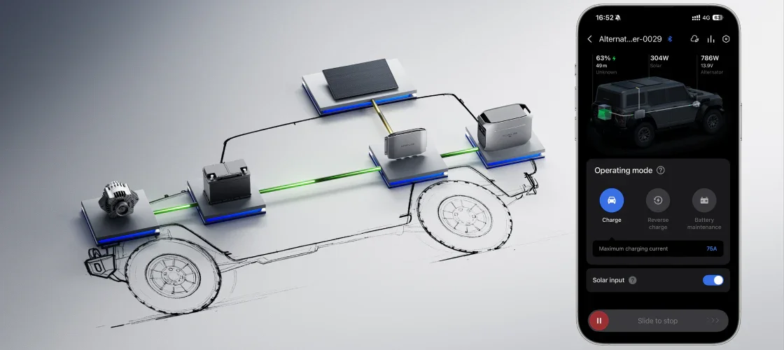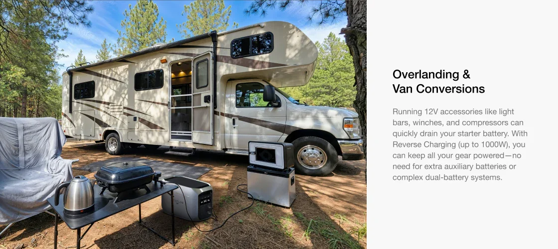 Skip traditional hardwired 12V batteries and DC-to-DC chargers. With a power station + alternator charger setup, you get ultimate flexibility: power onboard systems while driving, then take your power outdoors for lighting, cooking, or tools.